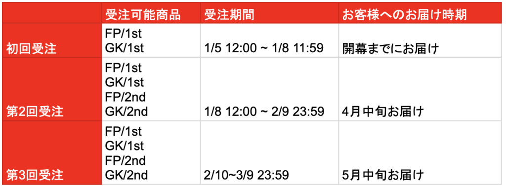初回受注生産に関してはFP、GKともに1stユニフォームのみご注文を受け付けます。