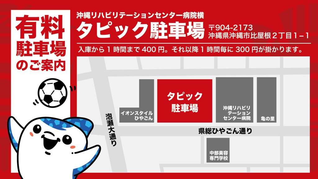 3月14日(土)に開催されるレノファ山口FC戦(沖縄県総合運動公園陸上競技場/14:00キックオフ)における、臨時駐車場&シャトルバス運行についてお知らせいたします。