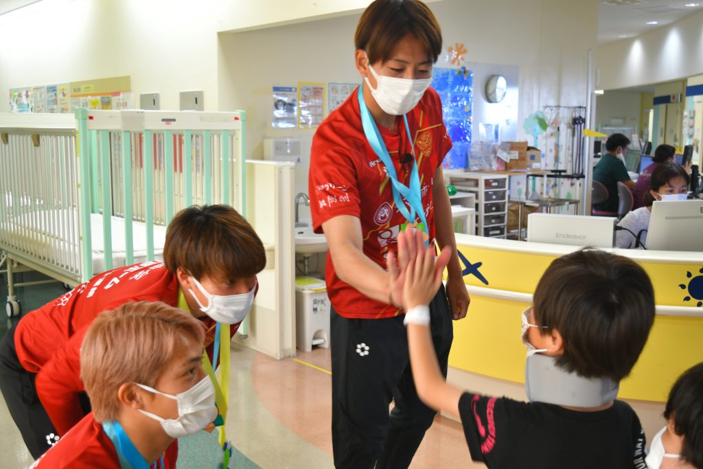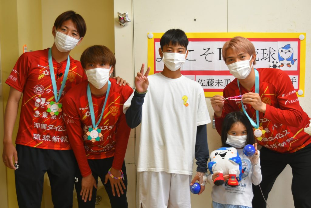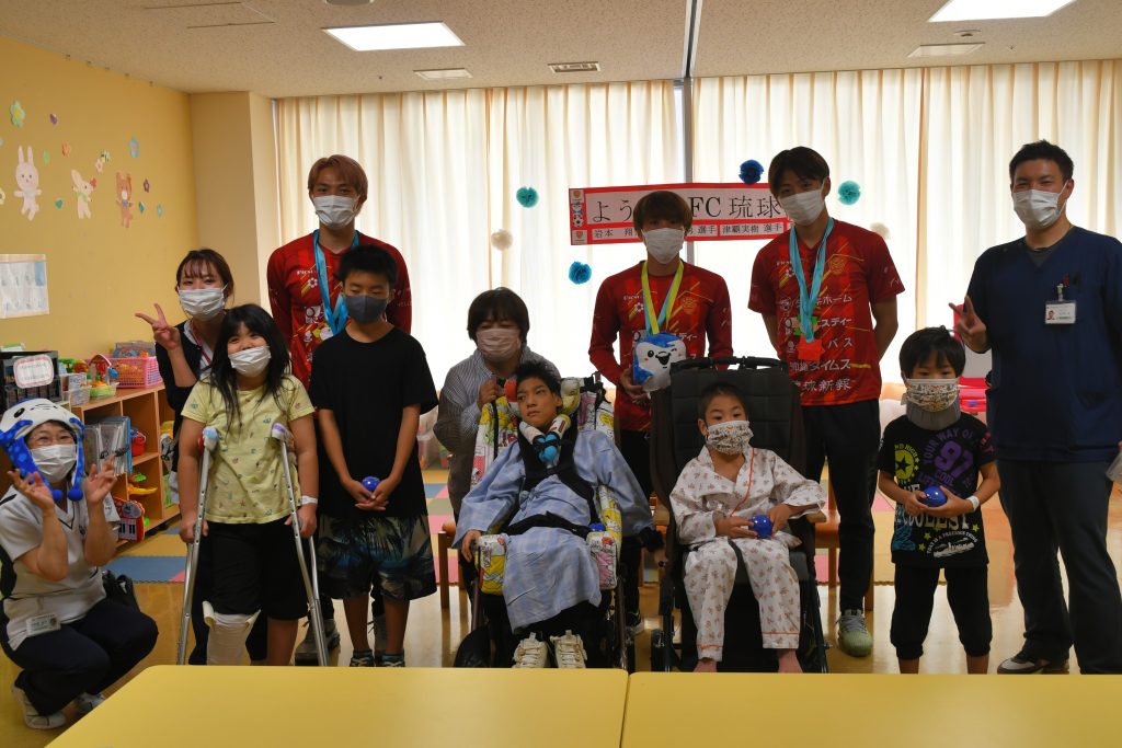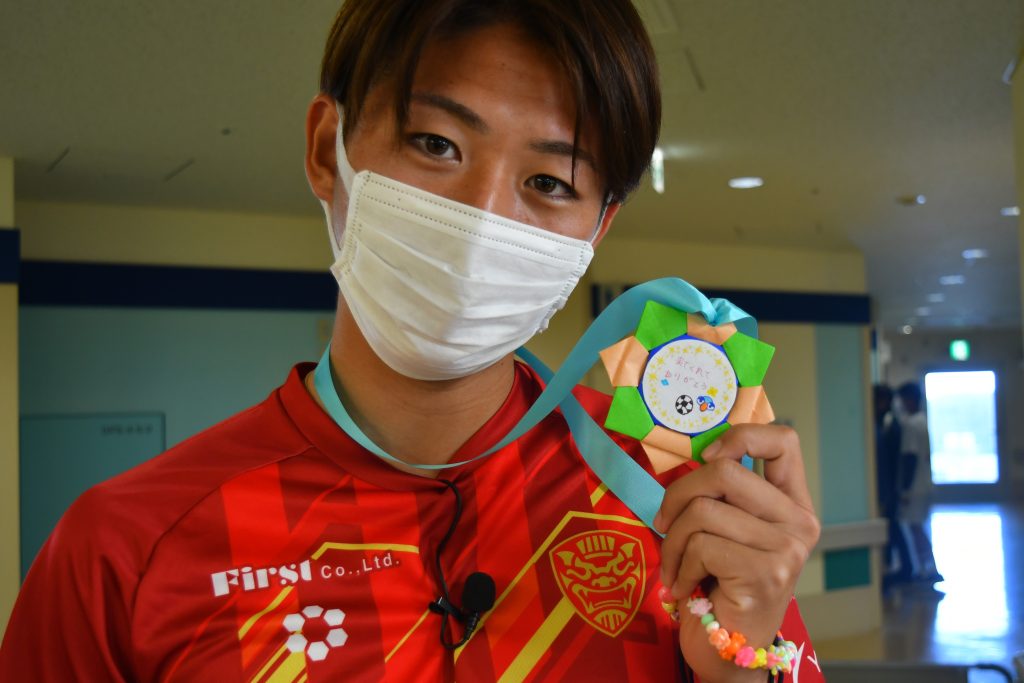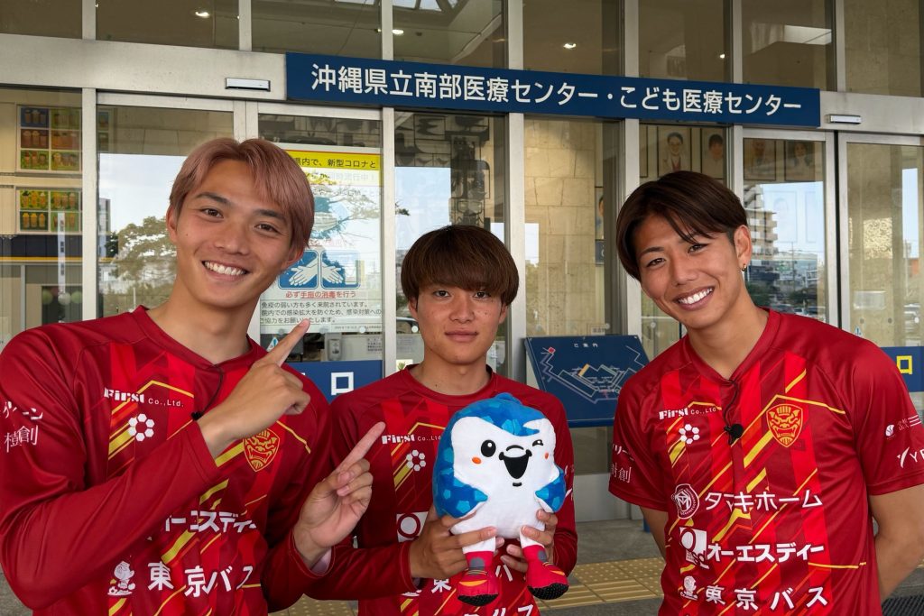 「自分の子どもも昨年、ここ南部医療センターで生まれました。そんな縁のある場所で頑張る子どもたちと触れ合えたことで、自分も勇気や元気をもらえました。この思いをサッカーに生かして、引き続き沖縄のために頑張っていきます!」