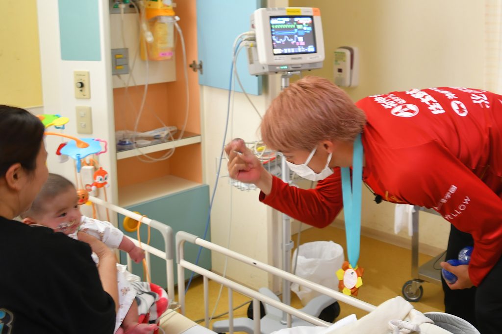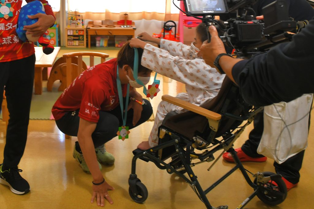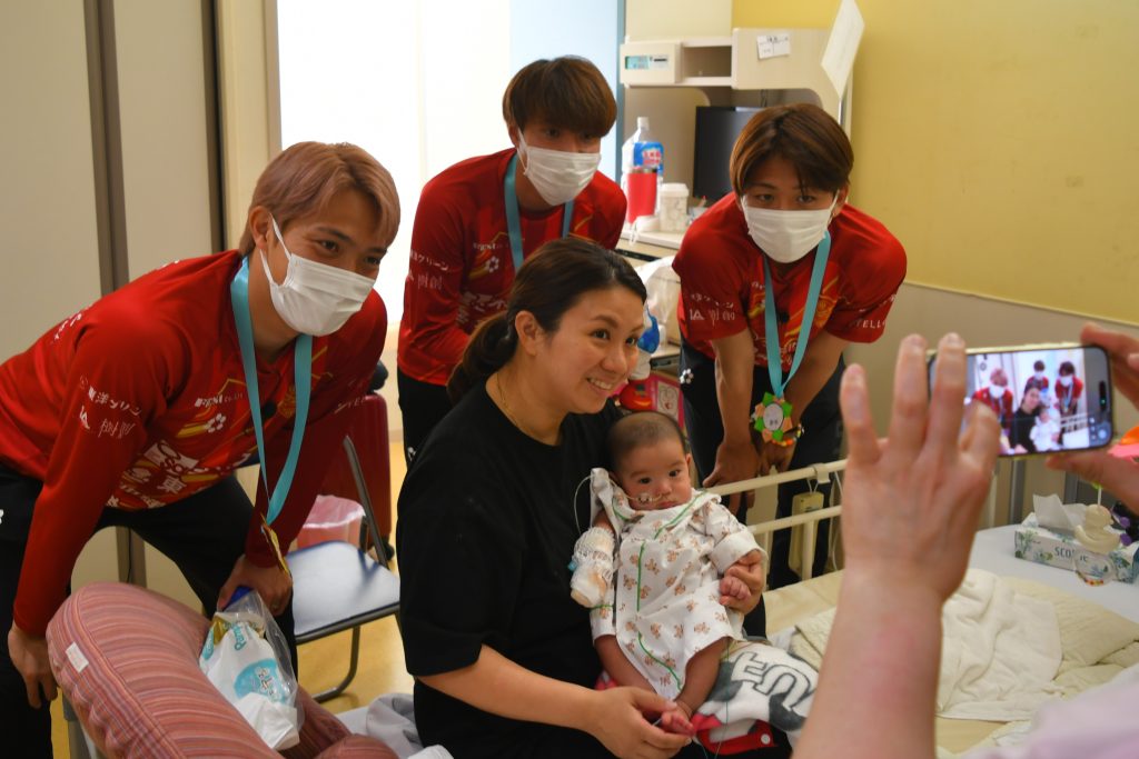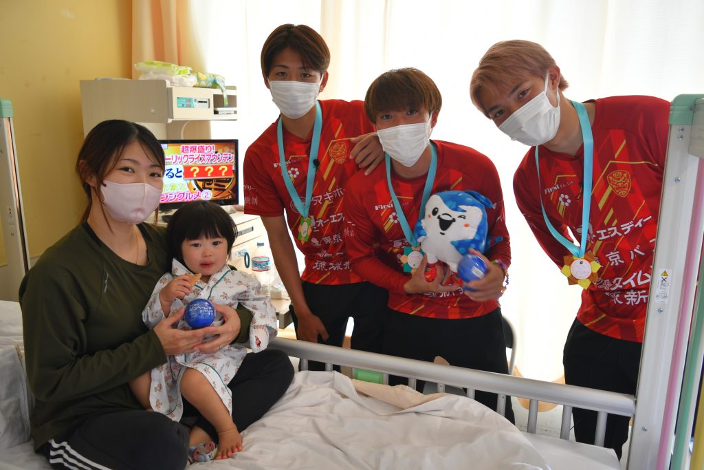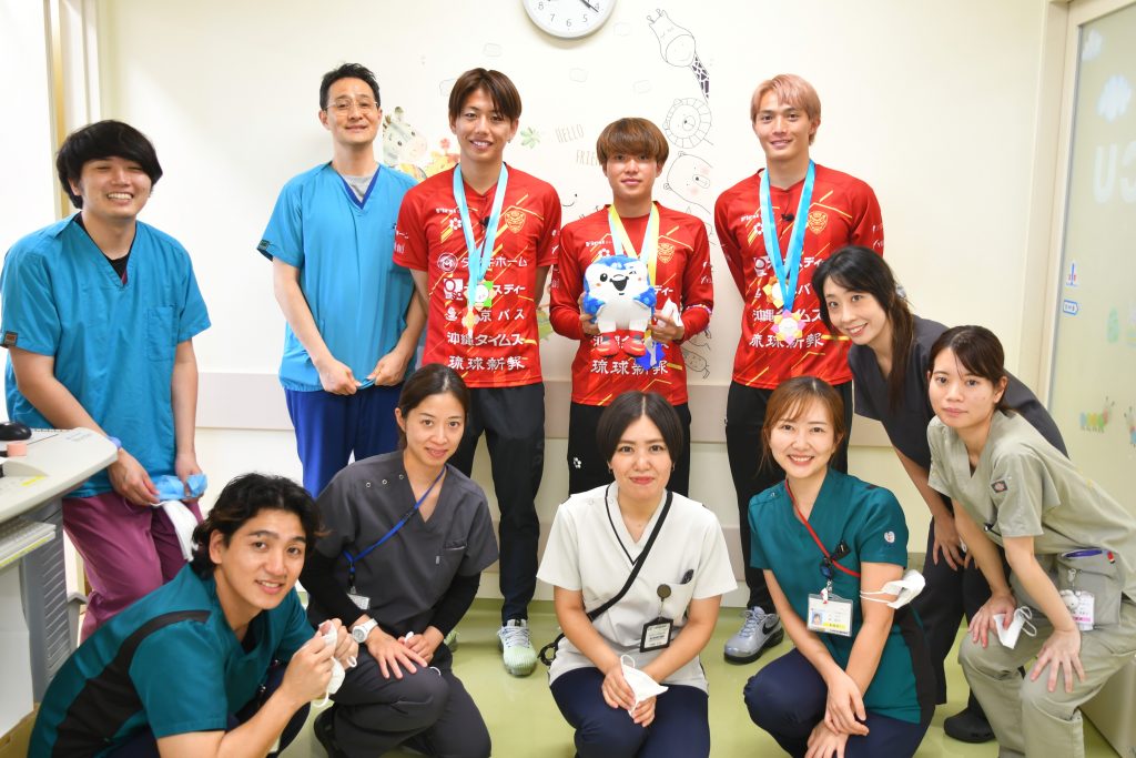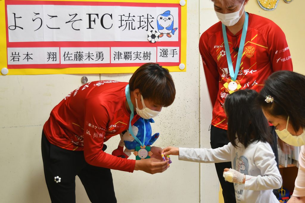「自分の子どもも昨年、ここ南部医療センターで生まれました。そんな縁のある場所で頑張る子どもたちと触れ合えたことで、自分も勇気や元気をもらえました。この思いをサッカーに生かして、引き続き沖縄のために頑張っていきます!」