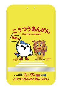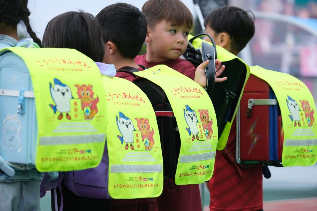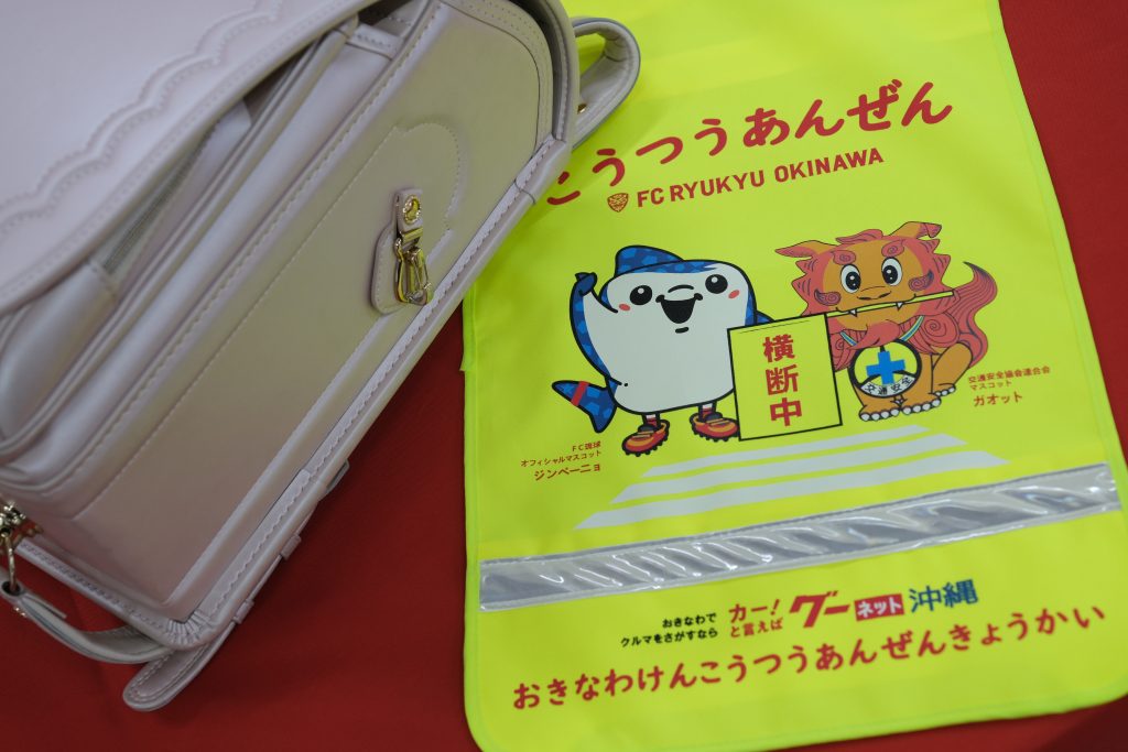 沖縄県交通安全協会連合会によって制作・寄贈いただいたジンベーニョデザインのランドセルカバーをエスコートキッズの皆様に贈呈いたします。
