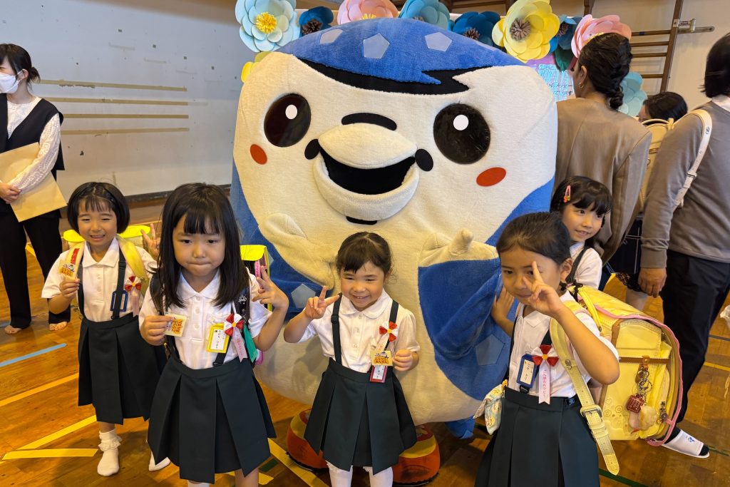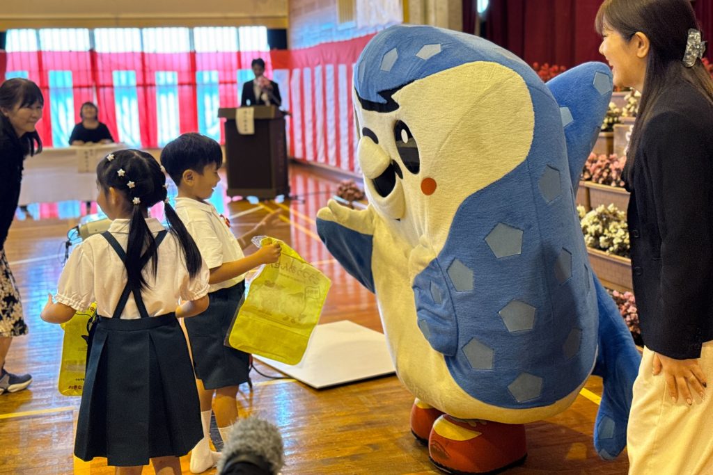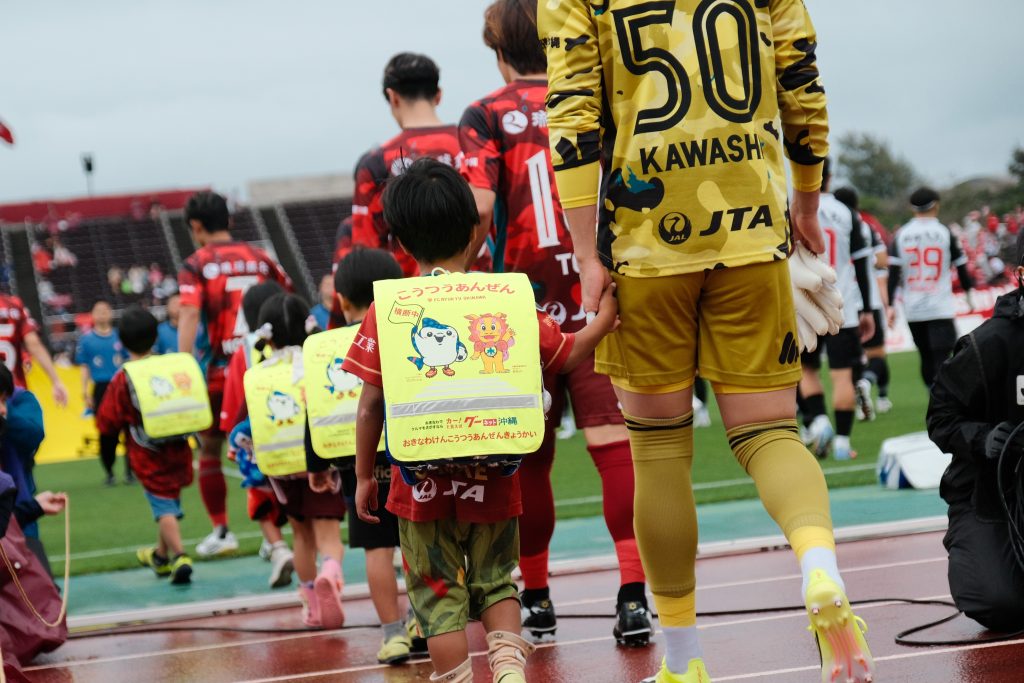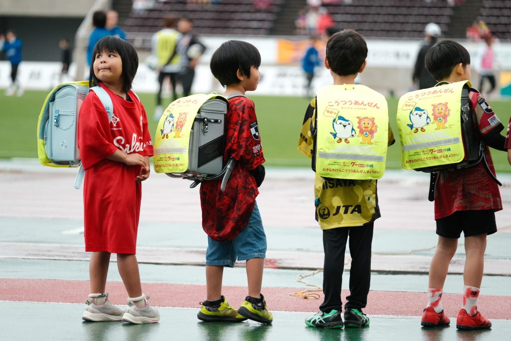 このたびの寄贈にあたり、4月4日(土)ロアッソ熊本戦にて、『ランドセルカバー贈呈式』を実施。新小学1年生限定の『エスコートキッズ』では、ランドセルカバーを着用した子どもたちが選手とともに笑顔で入場しました。また、4月9日(金)には宜野湾市立大山小学校の入学式へジンベーニョが参加。新1年生たちにランドセルカバーと特製ステッカーをプレゼントしました。