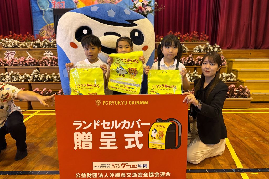 FC琉球はこのたび、沖縄感動パートナーの株式会社プロトソリューション様、および公益財団法人沖縄県交通安全協会連合会のご協力のもと、令和8年4月に沖縄県内の小学校に入学予定の新小学1年生にランドセルカバーを寄贈しました。