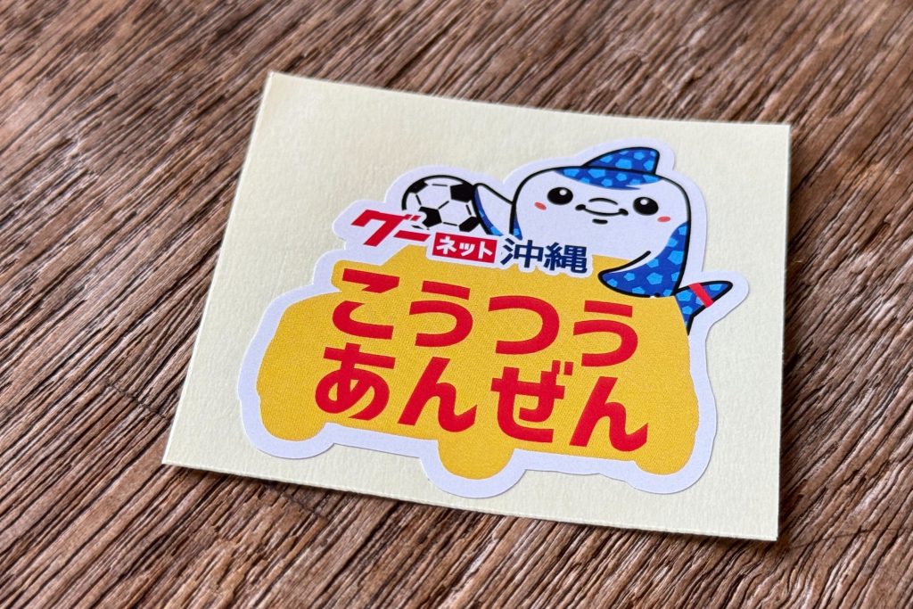 FC琉球のマスコット「ジンベーニョ」と、沖縄県交通安全協会連合会のマスコットである「ガオット」が仲良く横断歩道を渡るデザイン。夜道でも目立つように反射テープをあしらっております。