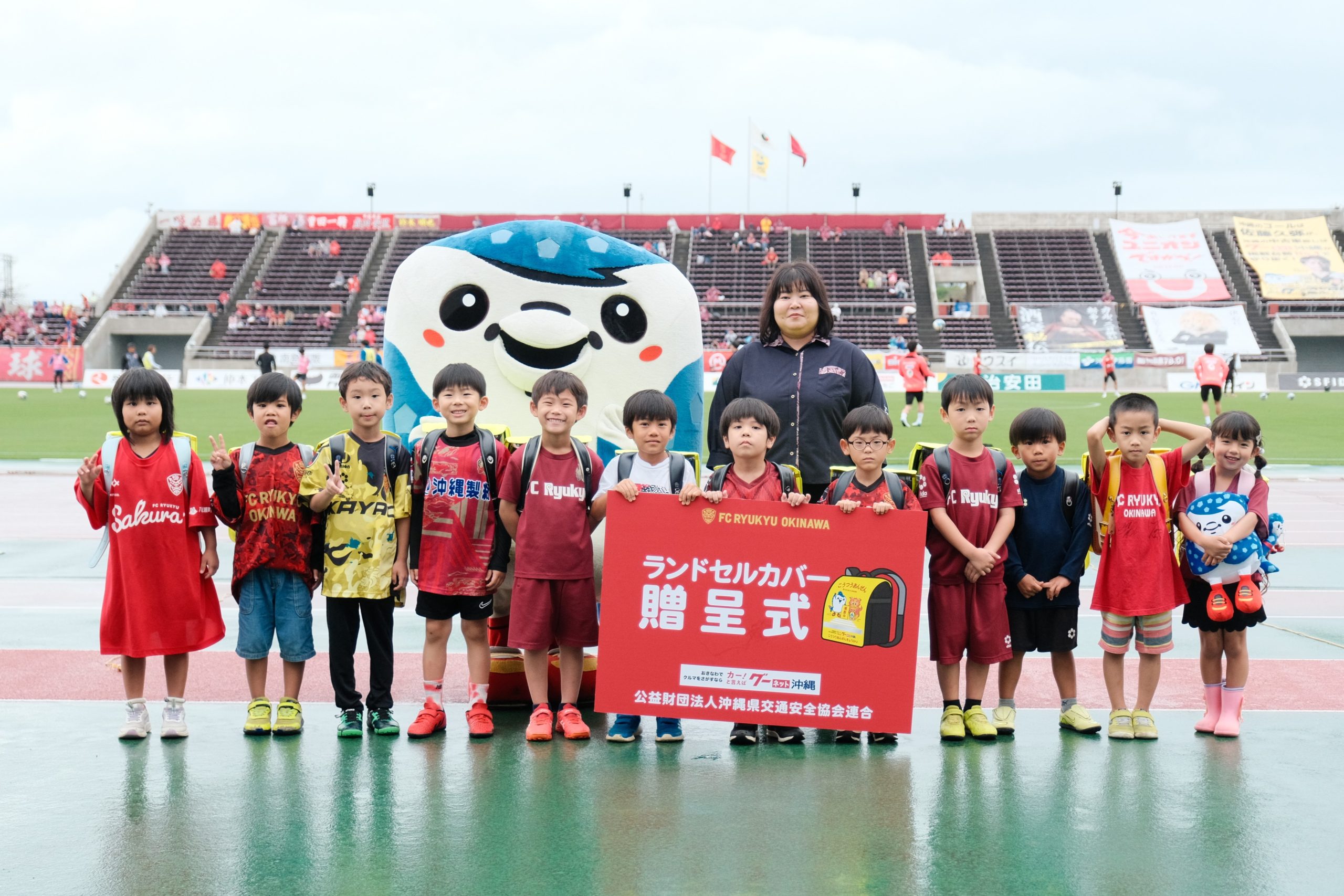 このたびの寄贈にあたり、4月4日(土)ロアッソ熊本戦にて、『ランドセルカバー贈呈式』を実施。新小学1年生限定の『エスコートキッズ』では、ランドセルカバーを着用した子どもたちが選手とともに笑顔で入場しました。また、4月9日(金)には宜野湾市立大山小学校の入学式へジンベーニョが参加。新1年生たちにランドセルカバーと特製ステッカーをプレゼントしました。