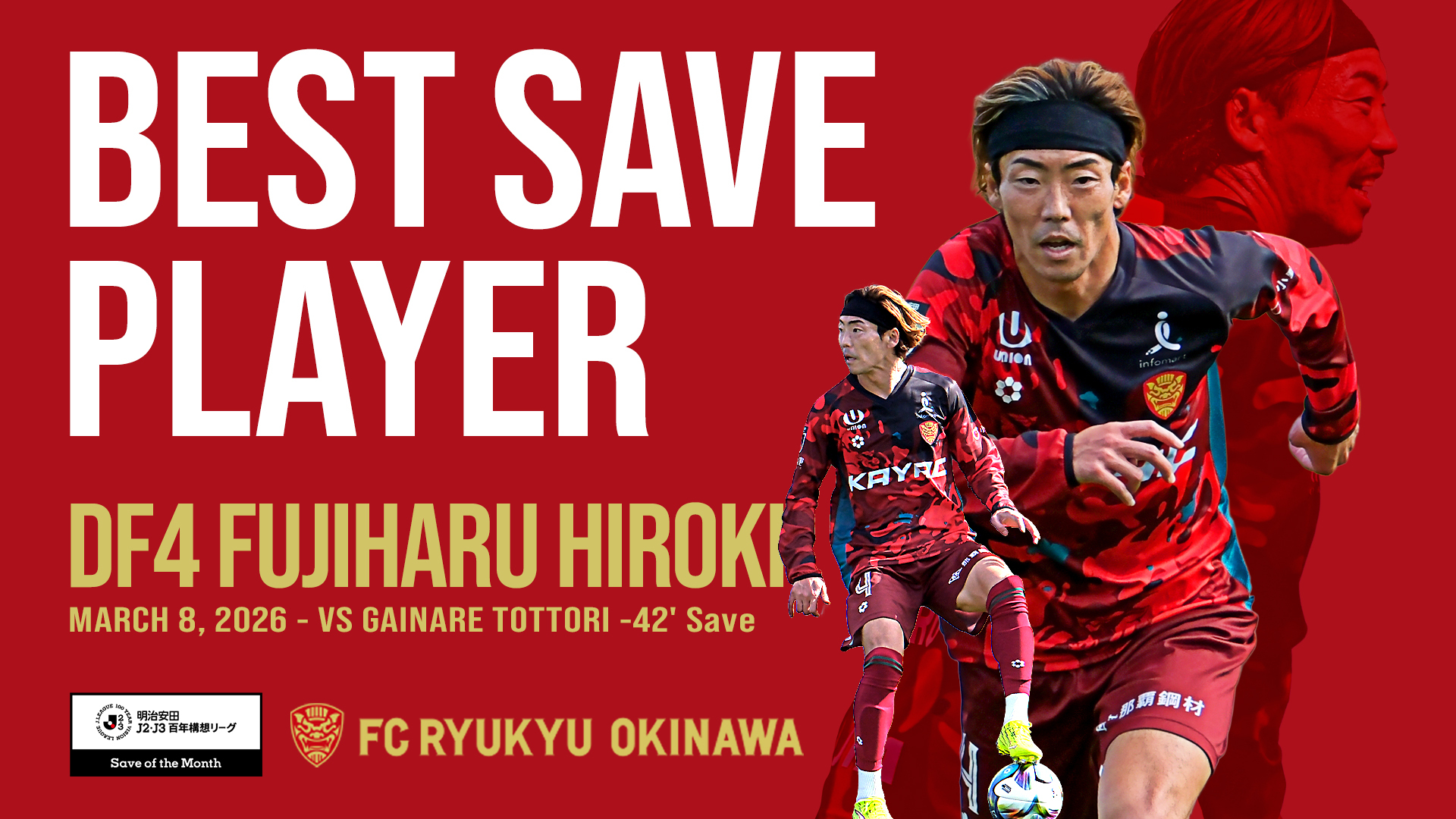 各月の明治安田Jリーグ百年構想リーグにおいて、 最も優れたセーブをした選手を称える「明治安田Jリーグ百年構想リーグ 月間ベストセーブ賞」の3月度の受賞選手が決定し、J2・J3リーグ WEST-BからはFC琉球の藤春廣輝選手が選出されましたので、お知らせいたします。